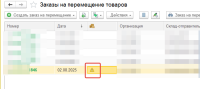 4. При этом в списке документов Заказы не перемещение товаров (в столбце "Соответствие накладной расходным и приходным ордерам по заказу") есть желтый треугольник с восклицательным знаком.